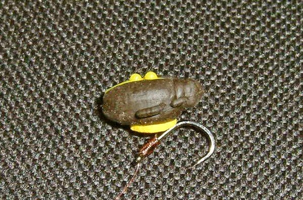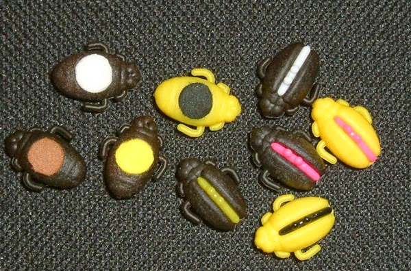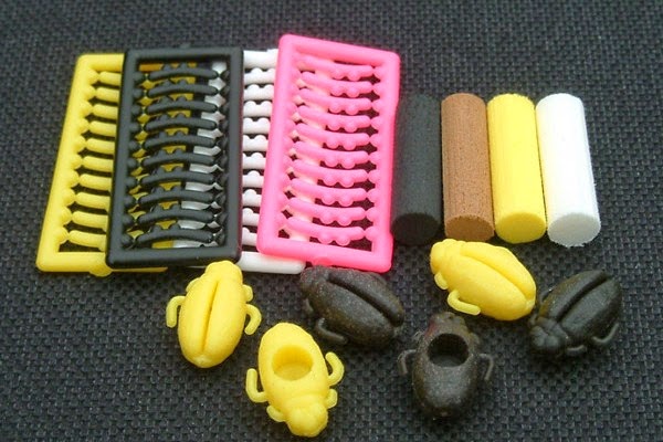 Du får detta i ett Zig Beetle paket: tre gula och tre bruna Beetles, fyra olika färgade rigfoam bitar och fyra olikfärgade, lite speciella hairstops.Man klipper till en bit av rigfoamen, så denna passar i kroppen och sticker en hairneedle genom det hela och drar sedan ut sin öglan och monterar hairstoppet, som sedan tryckas ner i skåran på ryggen av Beetlen och det är klart för aktion.