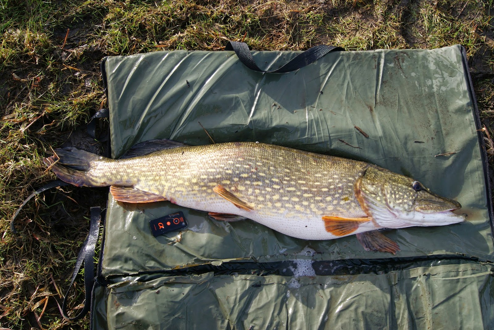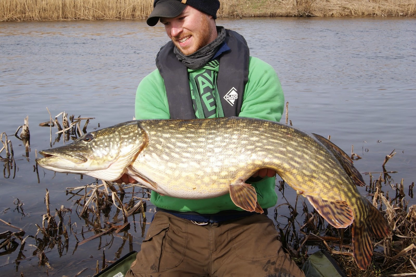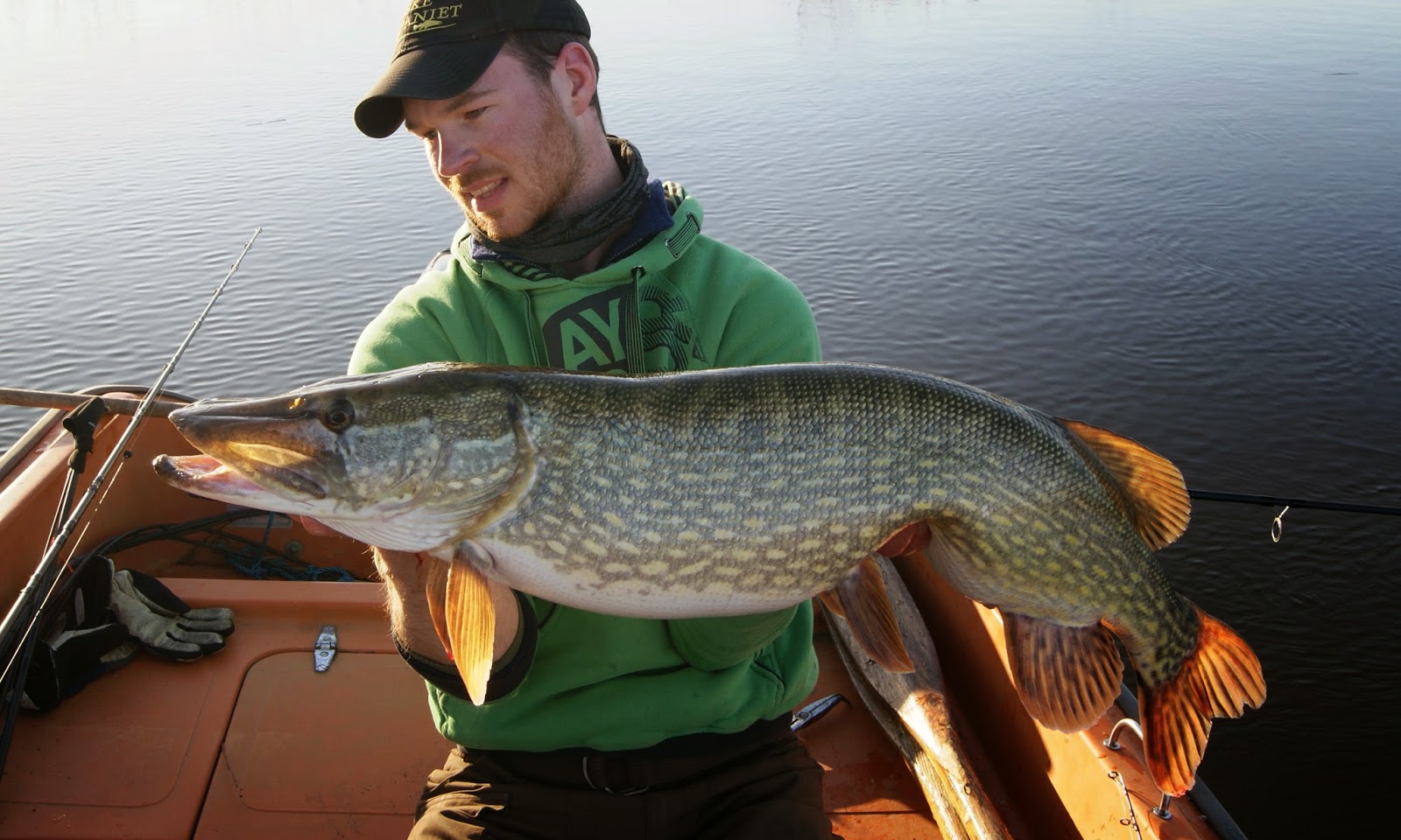 Efter återutsättningen åkte kaffetermosen fram och med en harmonisk känsla i kroppen njöt jag av att årets första tia var landad. Då jag hade ganska bra stirr på betesfiskarna valde jag att ge platsen en chans till. Efter en stund får jag ett märkligt hugg där flötet först sticker för att sedan ploppa upp och så håller det på ett par gånger.. Misstänker en öring eller en lite gädda som inte får in mörten ordentligt i munnen och tar därför inte hugget på fullt allvar. Därför blir jag tämligen förvånad när jag möts av en bra tyngd i mothugget. Tänker att det kan vara en skaplig fisk på en 7-8 kg för det kan ju inte vara en rökare till, eller? Pressar in fisken ganska hårt och det är först när hon dyker upp intill båten och ruskar med huvudet som jag inser att det är en riktigt bra fisk! Pulsen stiger och hon gör ett par kortare rusningar inne vid båten innan hon går i håven. Sekunderna senare ringer telefonen och jag kan skrika ut ett härligt glädjetjut till den smått förvånande Suggan! Då han är på väg till vattnet bestämmer jag mig för att hålla gäddan i håven till han anländer till platsen. I den stora Foxhåven står gäddan klockrent och då jag inte vill hantera fisken mer än nödvändigt väntar jag med mätning och vägning. Istället blir det ännu ett telefonsamtal till Tobbe medan jag väntar på Suggan