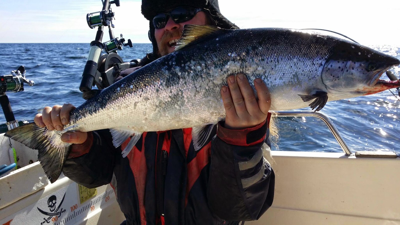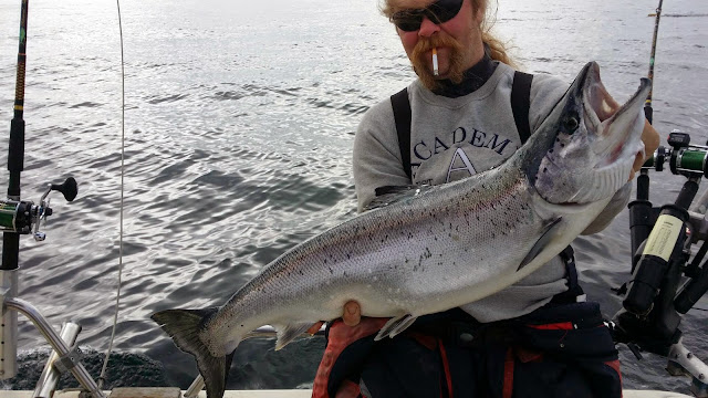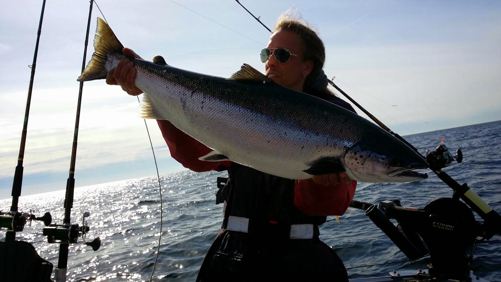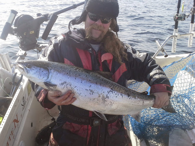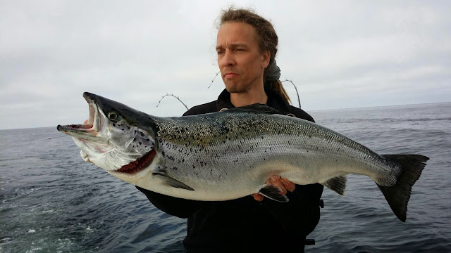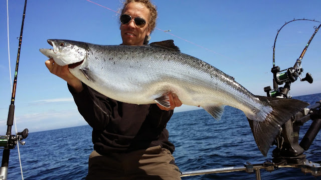 Utanför täckningsområde hela dagen, så en liten sammanfattning av dagen som började med ett trippelhugg på utlägg och fortsatte nästan lika bra resten av dan. 2 trippelhugg 2 dubbelhugg.  10 lax upp i båten 5 tappade varav en riktig gris. Nk mag s6 var bäst idag på riggen.