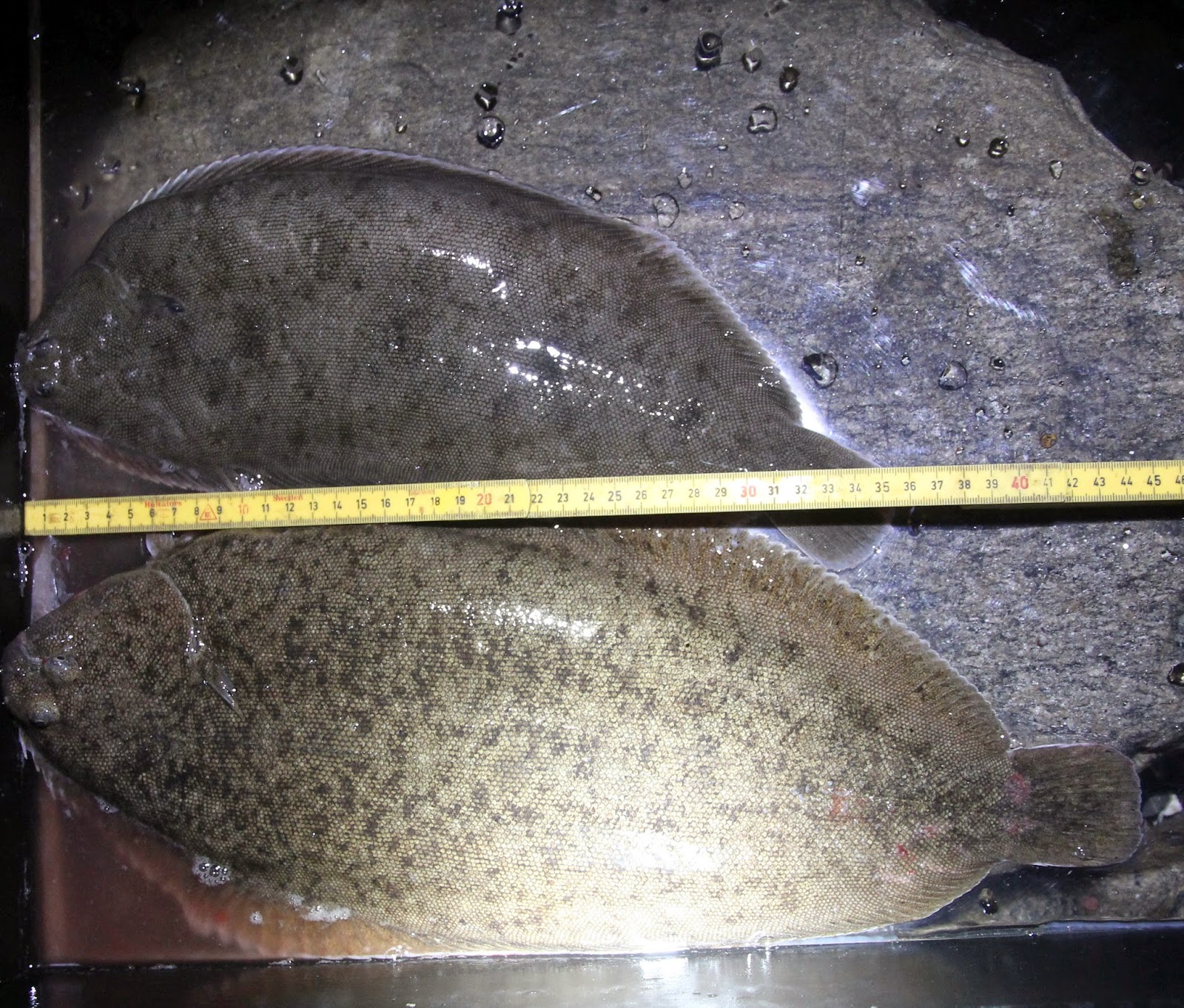 Vi la noen nye planer i bilen på vei til børstisplassen og holdt oss til dem. Etter å ha ordnet agn, vadet vi først en plass hvor det i grunn ikke skjedde stort. Den neste plassen derimot, der lå tungene på et 2x2kvm2 område hvor vi fikk fisket på noen hver. Jeg nappet opp en, gikk to meter, kjs fant en han fisket på og når han fisker på den kommer det brått to til sigende mens jeg ser på. Fisker på den største og etter myyye lurking får jeg omsider kroket den.