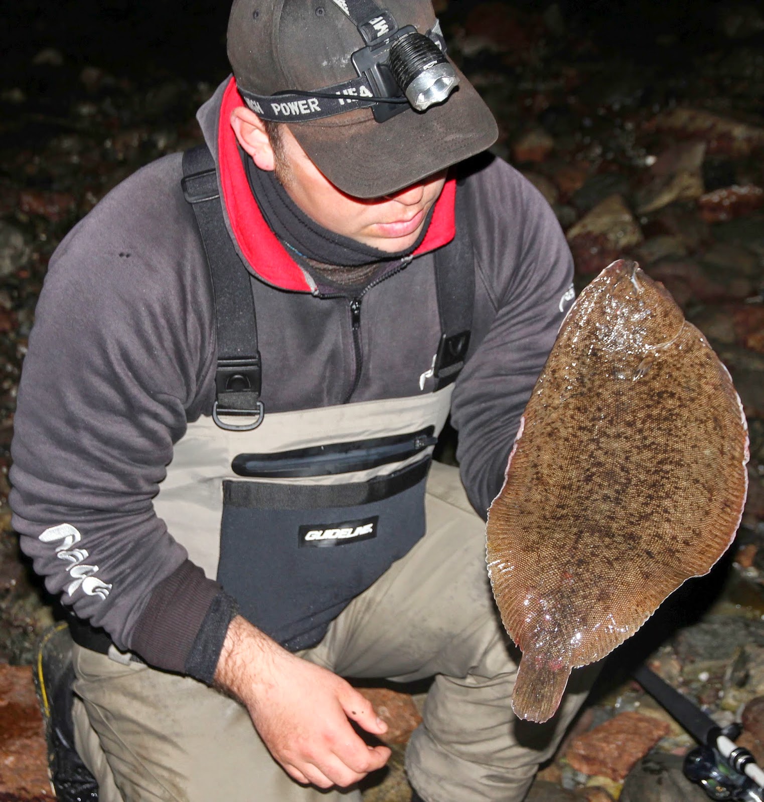 Denne plassen har vi kun besøkt en gang før, og den er latterlig kul. Ole-Håkon er først ut i vannet, og på 10cm dypt vann finner han en finfin tunge som tar agnet etter 5sekunder. Ny pers for østfoldingen og en meget fornøyd fisker.