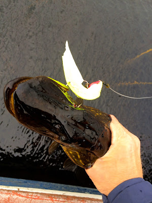 Tisdagens tur var blöt och blåsig och gick därför helt i gäddans tecken. Nu när geggan närmast strandkanterna börjar att glesna lite gjorde jag första försöket att fiska där sedan i våras. Det är offsetkrok som gäller, ett riggning jag inte är särskilt förtjust i. Dels bommas en hel del fisk och dels orsakar den stora enkelkroken ofta fula skador på de fiskar som krokas. Men då jag hittade en enda offsetkrok som låg längst ned i en låda så riggade jag en 6' Kopyto. Det small direkt.