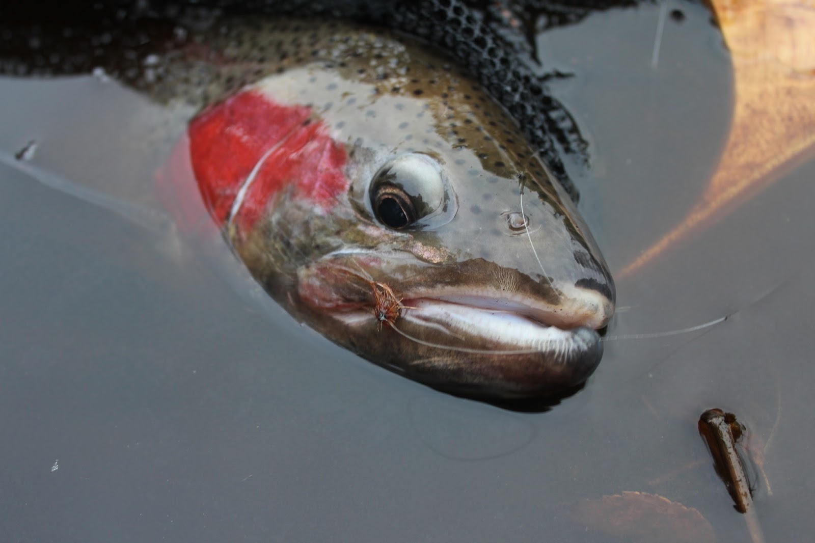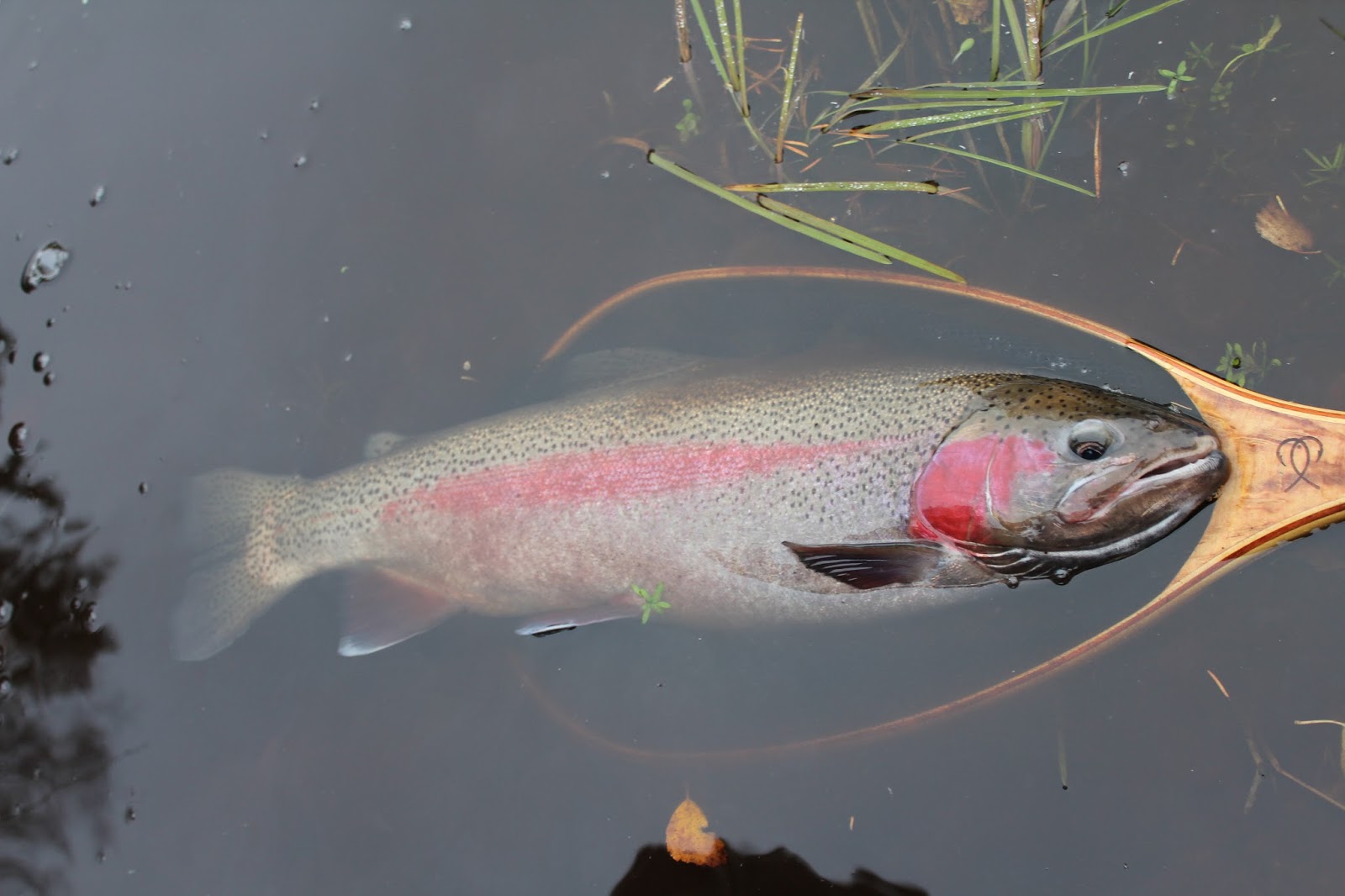 Min kläckare försvann omgående i ett vackert head&tail-vak och ett par sekunder senare utfördes ett kliniskt mothugg. Kaos utbröt när fisken blixtsnabbt sicksackade sig fram mellan stenpartierna i pool fem, men efter ett par minuter gled en praktfull hanfisk in i håven.