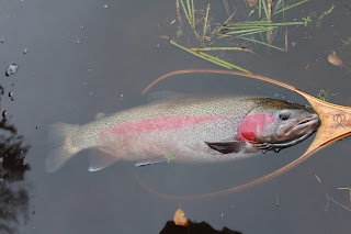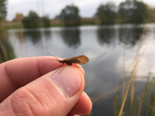Eftermiddagarna bjöd på glimtar av värmande höstsol och dessa medförde rikliga kläckningar av både knott & nattsländor. En perfekt presenterad nattslända (streaking caddis alternativt busen) resulterade emellanåt i våldsamma påslag och häftiga kamper.