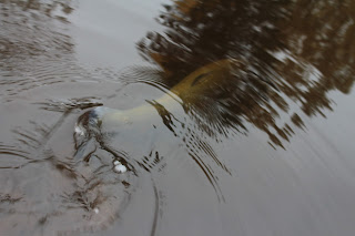 Strömsträckans individer hade sånär gått i lek och var således inte alls intresserade av mina torrflugor. Däremot i den bortre delen av dammen vakade fiskarna titt som tätt i vindkanterna. I havet av fallna björklöv fann de små godbitar i form av bladlöss, knott och fjädermygg. Försiktiga sippvak blandat med exemplariska head&tail-vak avlöste varandra, men något större intresse för mina flugor visades verkligen inte.