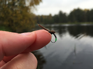 Precis under den färgsprakande vattenytan - bland björklöv i regnbågens alla färger - cruisade en skaplig fisk runt och kalasade på något smått som hängde i ytfilmen. Insektslivet var i det närmsta obefintligt just denna höstdag, så det tog sin lilla tid att lista ut vad som stod på menyn. En nattslända flimrade förbi i ögonvrån och flugvalet föll instinktivt på en nattsländekläckare.