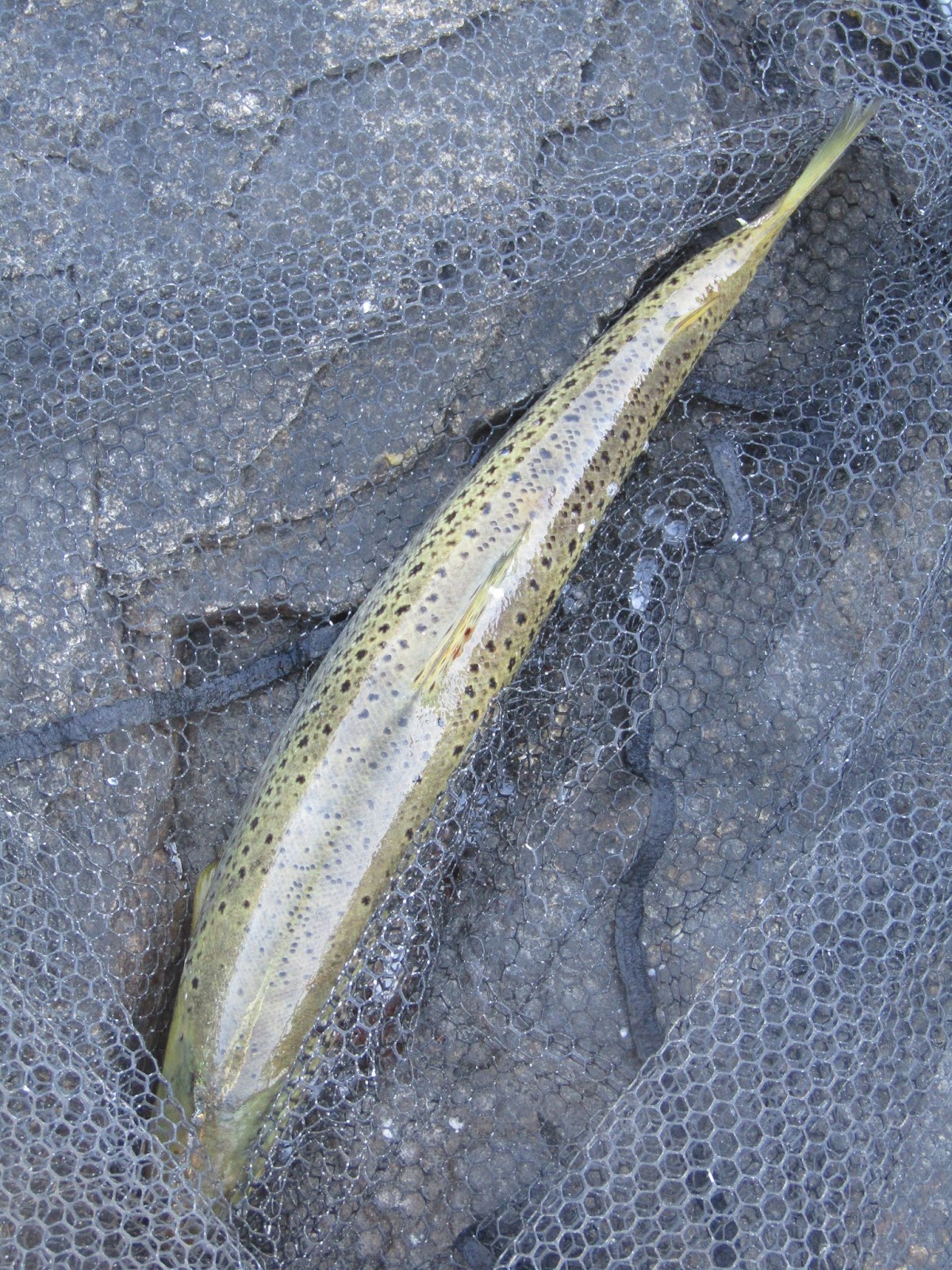 Fisken gör en 20 meters rusning och sedan en till. Den skakar och knycker och jag blir mer och mer övertygad om öring.