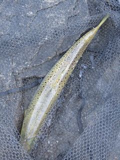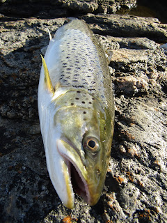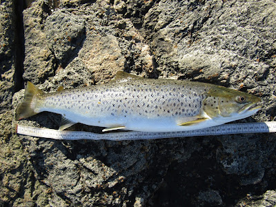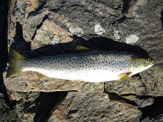 Först tycker jag nästan att det ser ut som en havsabborre men sedan skymtar jag fläckar och när fisken hoppar rakt upp i luften så ser jag klart min kombattant - en riktigt fin och tjock öring.