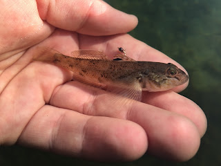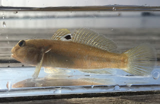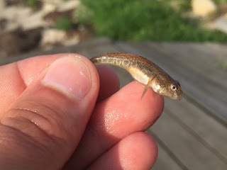 När fisken närmade sig vattenytan såg jag en distinkt fläck på bakre delen av främre ryggfenan och det kunde ju bara betyda att en ny art var krokad. Leken blev genast till blodigt allvar och jag inväntade precis rätt tillfälle att lyfta upp den frenetiskt sprattlande fisken ur vattnet. Väl i fältakvariet kunde jag snabbt konstatera att det rörde sig om den invasiva arten svartmunnad smörbult - en art som jag trodde skulle bli något knepigare att komma till tals med.