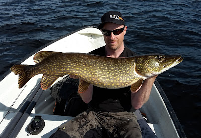 Just detta med att ta en gädda över 10 kilo har varit en morot för Bosse. Han har varit nära några gånger med gäddor en bra bit över 9 kilo men nu kom den äntligen och det med minsta möjliga marginal. Vi gjorde dock tre vägningar för att vara säkra där alla visade 10 kilo. Någon längd tog vi inte då vi ville få den tillbaka snabbt. Men det var helt klart en lång fisk som jag uppskattar till minst 115 cm. Om någon förtjänat denna gädda väl så är det just Bosse. Han har fiskat flitigt under de senaste somrarna och även utvecklas i sitt fiskande.