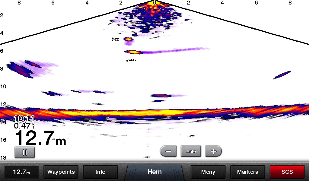 Tittar ni noga på bilden ser ni att jag skrivit jigg på den översta gula klumpen och gädda på den understa. Den kom som en raket från sidan och tog stenhårt!