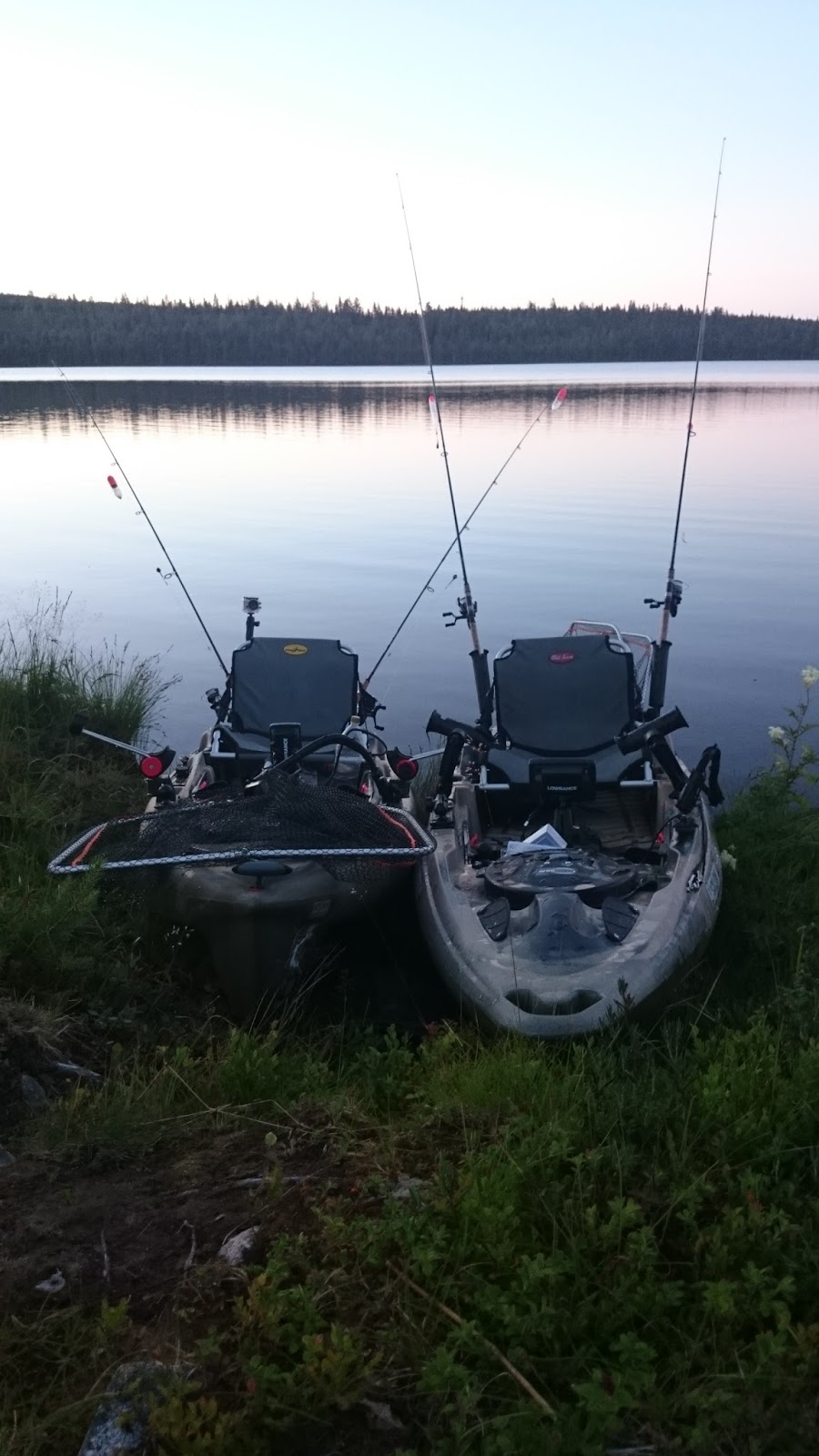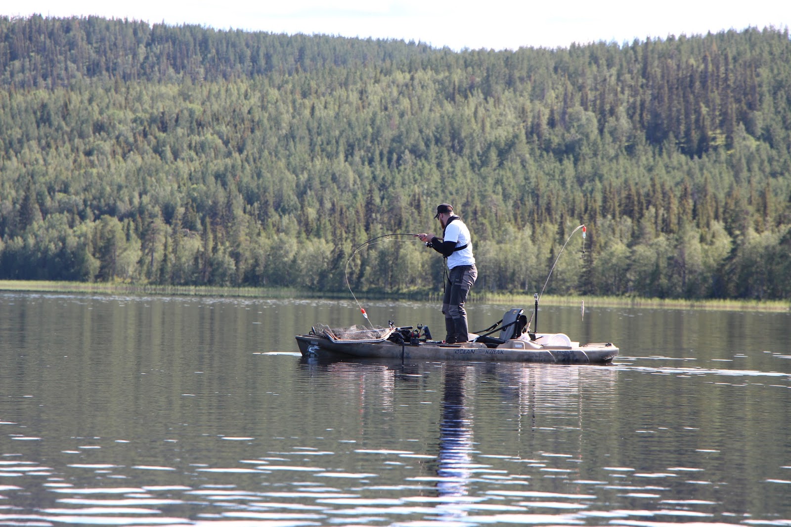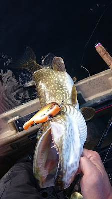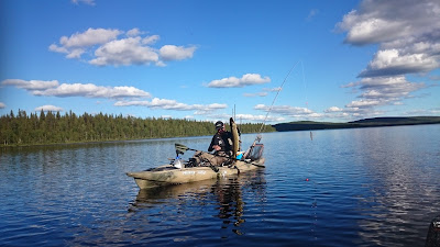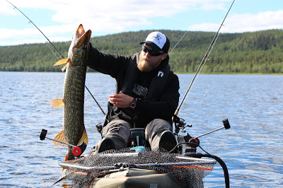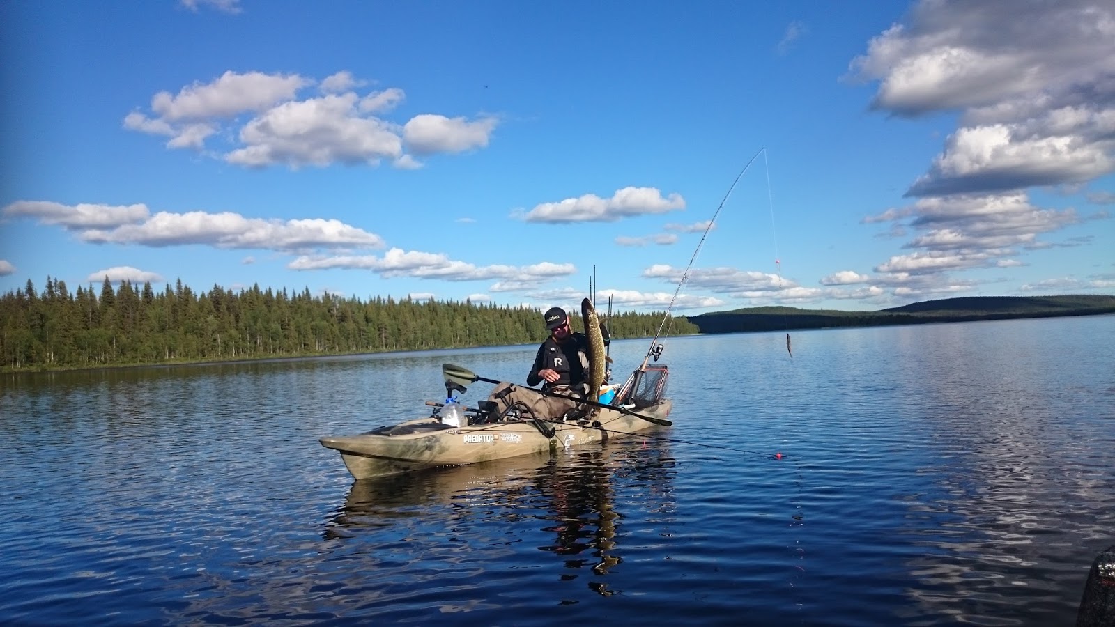Tisdagen började liksom kvällen innan. Inte många minuter innan Lali igen drillar urstark klarvattengädda så rullen skriker i rusningarna. Hittills hade vi inte landat några jättegäddor, men många i 3-5 kilos klassen. Brutalstarka fiskar och egentligen helt obegripligt hur man hamnade drilla vissa innan man lyckades kroka av dem vid kajaken. Försökte ju förstås göra det så snabbt och smidigt som möjligt för att inte dränera gäddorna på alla krafter i fighterna.