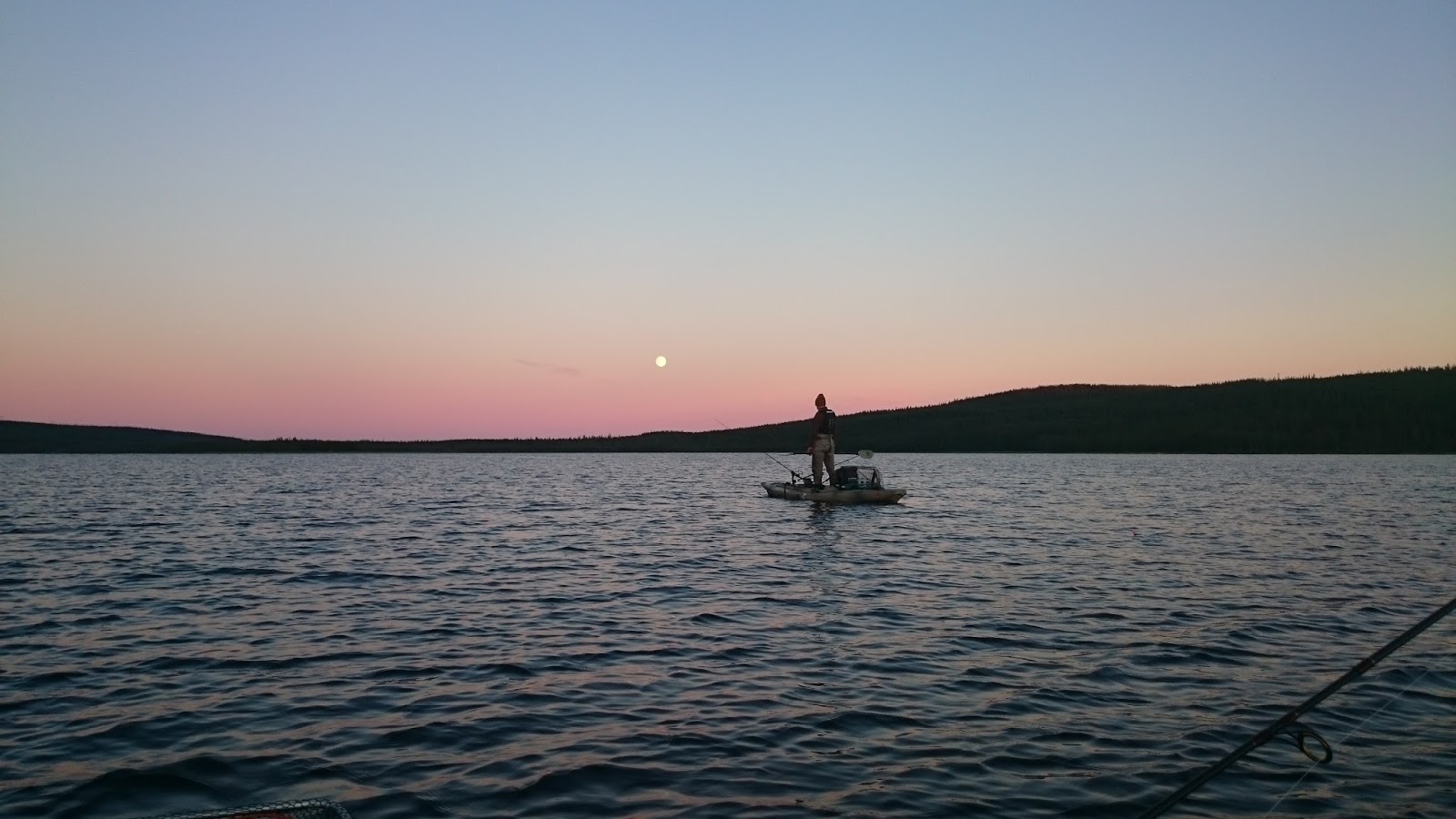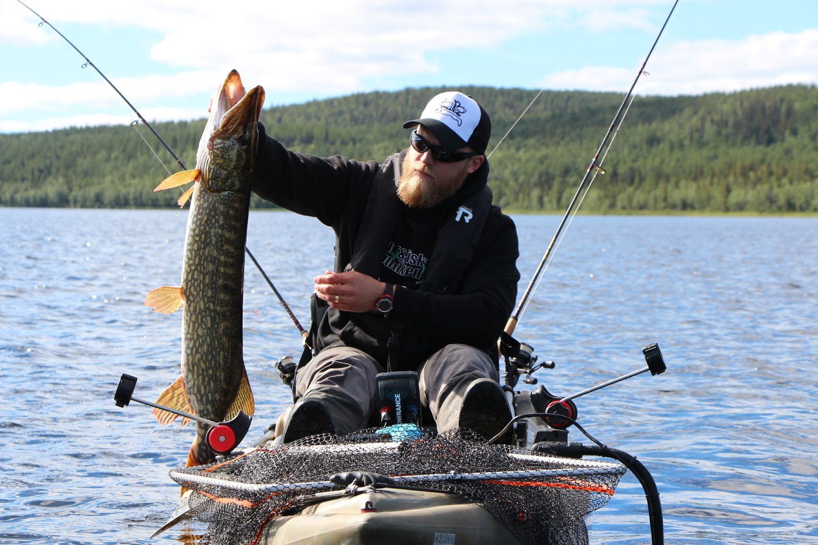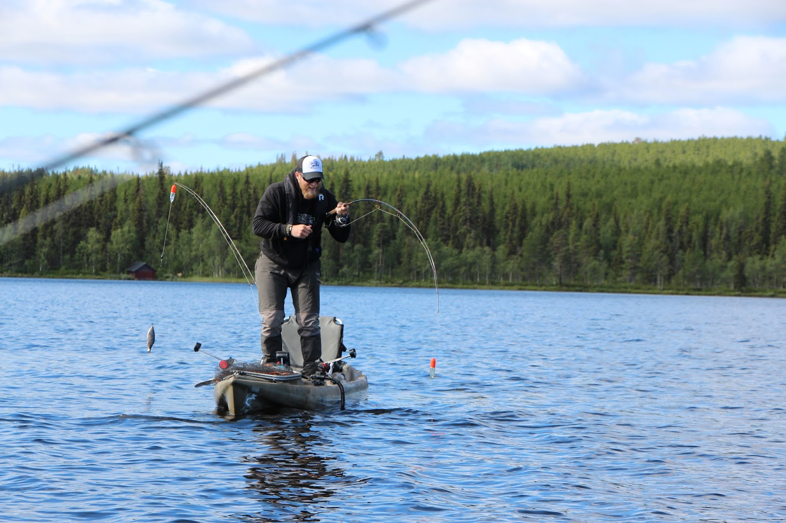 Tisdagen började liksom kvällen innan. Inte många minuter innan Lali igen drillar urstark klarvattengädda så rullen skriker i rusningarna. Hittills hade vi inte landat några jättegäddor, men många i 3-5 kilos klassen. Brutalstarka fiskar och egentligen helt obegripligt hur man hamnade drilla vissa innan man lyckades kroka av dem vid kajaken. Försökte ju förstås göra det så snabbt och smidigt som möjligt för att inte dränera gäddorna på alla krafter i fighterna.