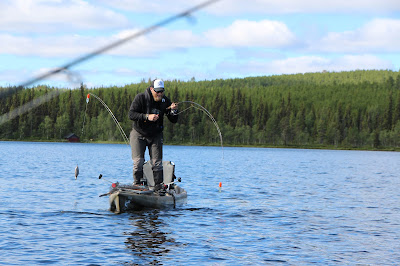 Förvånande för mig var, hur otroligt effektivt metet och flötestrollingen med döda betesfiskar var. I min värld har man hittills plockat fram metspöna och baitrunners-rullarna först till senhösten och den tidiga våren. Överraskande, men samtidigt lite förståeligt, eftersom vattentemperaturen var betydligt lägre i sjön där vi fiskade än här hemma.