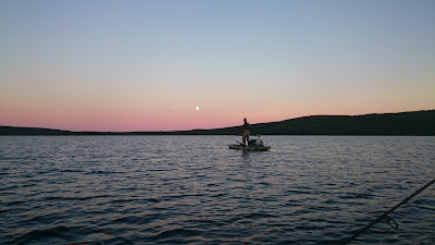 Måndagkväll gav totalt 7-8 st. gäddor och vid 12-01 tiden paddlade vi iland för att sova nån timme innan morgonpasset.