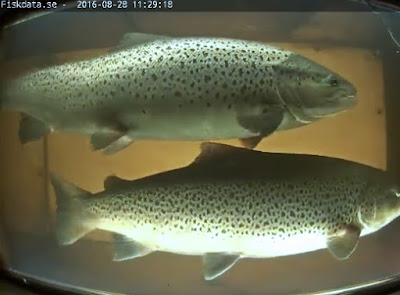 "Så här stor uppvandring av lax och havsöring har det inte varit i Testeboån sedan kraftverken byggdes för mycket länge sedan ! " Havsöring dominerar i antal. Igår var det fem fiskar mellan nittio cm och en meters längd. Ibland är det köbildning i vår fiskräknare.