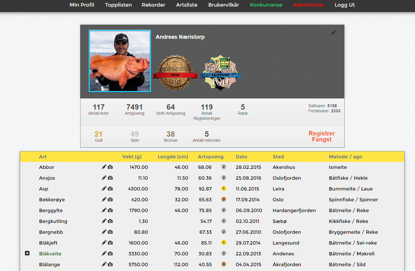På disse sidene kan du legge opp nye perser også etterhvert, så samles alle fisk av samme art du har fått slik at du på sikt generer en slags toppliste over fisk du har fått.