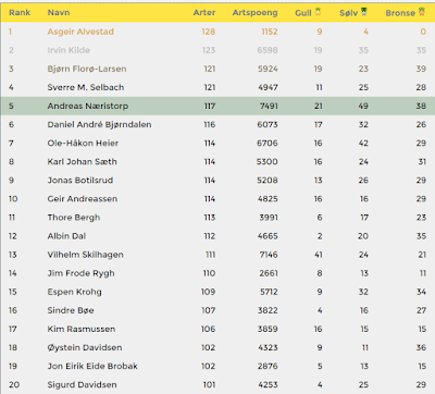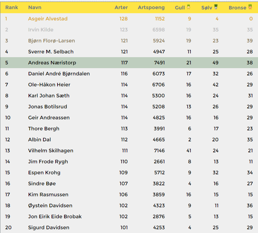 Det lages også lister over alle som har mest arter i Norge og en hel rekke andre funksjoner.