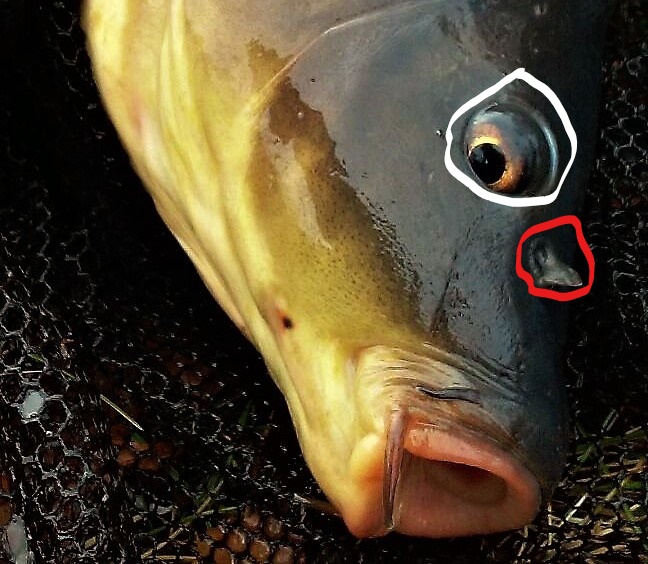 Karpen har även ett bra luktsinne och egentligen behöver vi inte doftmedel i våra beten, de känner aminosyror från sin föda t ex fjädermygglarver och annat och har detta i generna och vi ska var försiktiga med dofter som är starka typ: deodorant, bensin, tobak, olja mm som inte gillas så värst mycket och det bästa du kan göra är att tvätta dina händer i dy innan du påbörjar monteringen av dina beten mm. röd markerad är karpens näsborr.