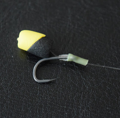 Detta förhindrar att knuten stryps och betet vrider sig fel på krokskaftet och det ger lite extra styrka också, avslut gärna med en liten bit silicontubing över kroköglan, det ökar gapet lite och klipp den i 45 grader, det hjälper att kroken hamnar karpens underkäke.