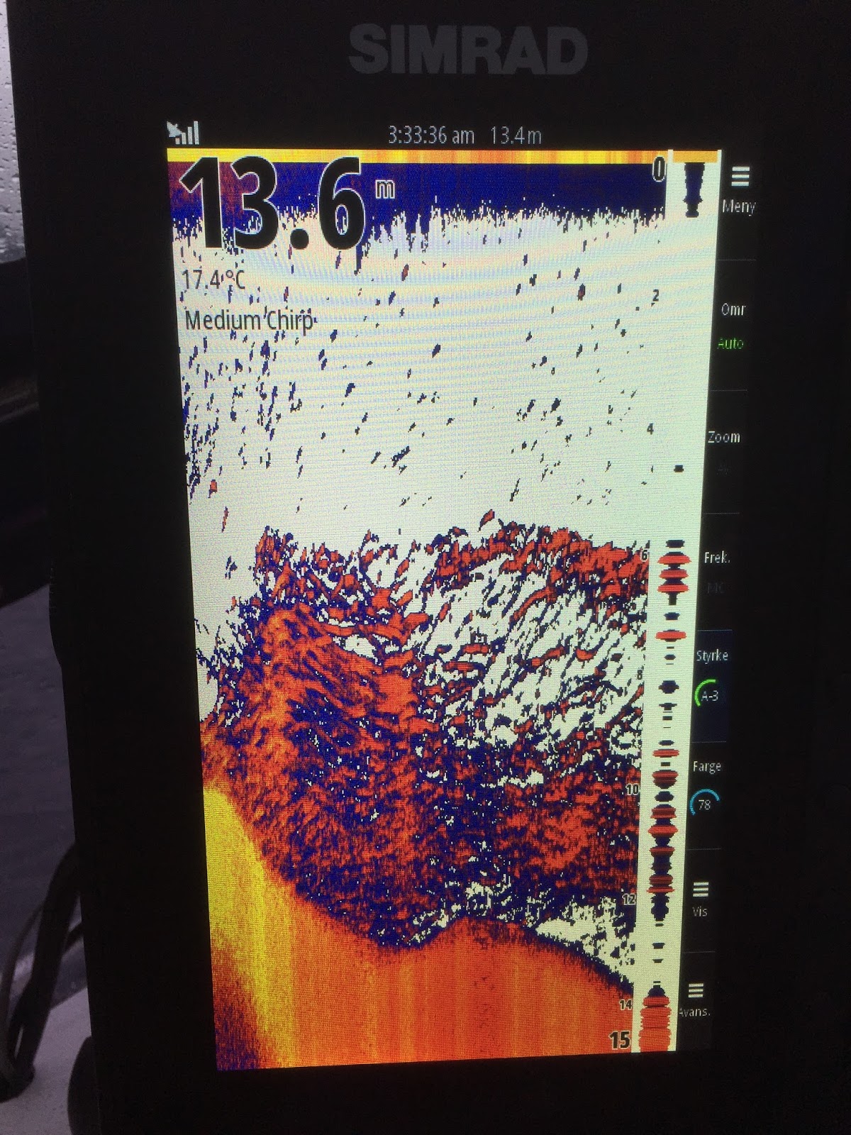 Det ble ikke bare lek med elektronikken, til slutt fant vi fisken også, Simraden ga ingen rom for tvil da vi passerte en terskel og så dette:
