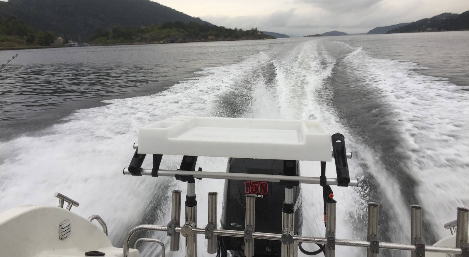 Hovedmotoren er en Suzuki 150, og som jeg har skrevet endel om før er Suzuki ofte forbundet med støy på følsom elektronikk som ekkolodd og VHF. I denne båten går elektronikken på eget forbruksbatteri, med relé til startbatteriet. Det første vi testet var å dra båten opp i 7-8 knop, ekkoloddet ble nesten helt svart av støy. Så kutter vi motoren helt, slår den av, mens båten er i fart. Hensikten er å sjekke om støyen kommer fra motoren, eller turbulens langs skroget. Siden Galia har dyp V-bunn er den ikke ideell for aktermontert ekkoloddgiver, men med det i bakhodet er plasseringen av ekkoloddgiverne omtrent så optimal man kan få til på denne båten.