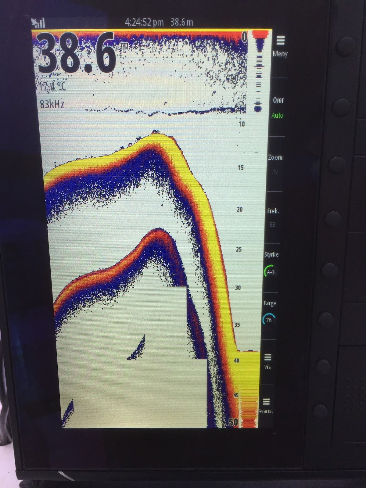 Vi hadde ikke med oss agn i dag, så vi ga oss på dypet ganske fort og gikk løs på dagens neste prosjekt som var å finne sild eller makrell vi kunne gi til Akvariet i Drøbak, de trenger mye forfisk til rovfiskene sine. Vi kjørte både hit og dit, frem og tilbake men slet litt med å finne de store stimene. Vi fant for all del mindre ansamlinger langs diverse kanter, men de virkelig store stimene dukket ikke opp. Dog ga all kjøringen mulighet til å teste en ting jeg ikke likte, ekkoloddet fikk nemlig mye støy når båten ble kjørt med hovedmotoren og farten gikk over 2,5 knop.