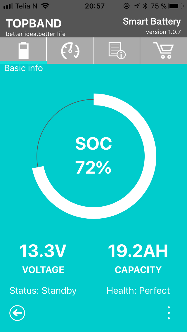 Batteriet har tapt 28% av sin kapasitet (SOC) på fire måneder. LiFePo taper tilsynelatende kapasitet noe raskere enn mine blybaserte batterier, og tar heldigvis mindre skade av det, men poenget er at batterier lades ut av seg selv uansett type og prislapp.