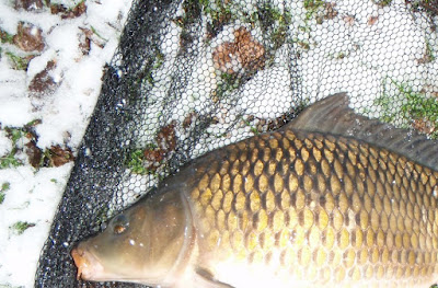 Snön föll så fint och likaså två snipor, som föll för mina Sardiner och det var nog dags att inse fakta. Jag lade ut 15 - 20 majskorn rakt över flötet med en Spomb, tog in flötet och plockade ihop gäddspöna och resten av grejerna.