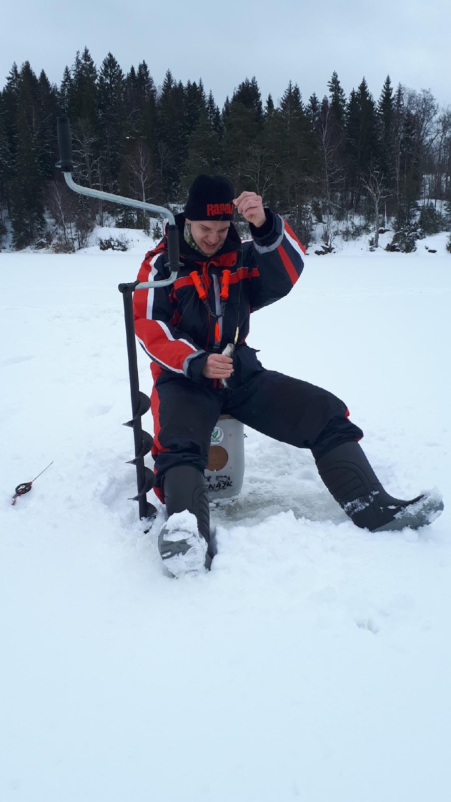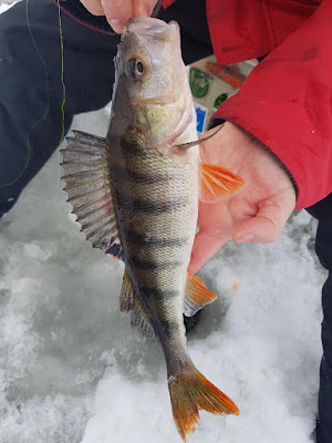 Har varit dött en lång tid nu på bloggen men det beror helt enkelt på att det inte har fiskats på hela vintern. Men i söndags var det äntligen dags igen och abborrarna var riktigt på hugget. När vi väl hittade dom högg det i dom flesta hålen. Har fått en abborre på pimpel som vägde 1,2 kg på den här platsen, men nu fick vi nöja oss med toppfiskar runt 300g.