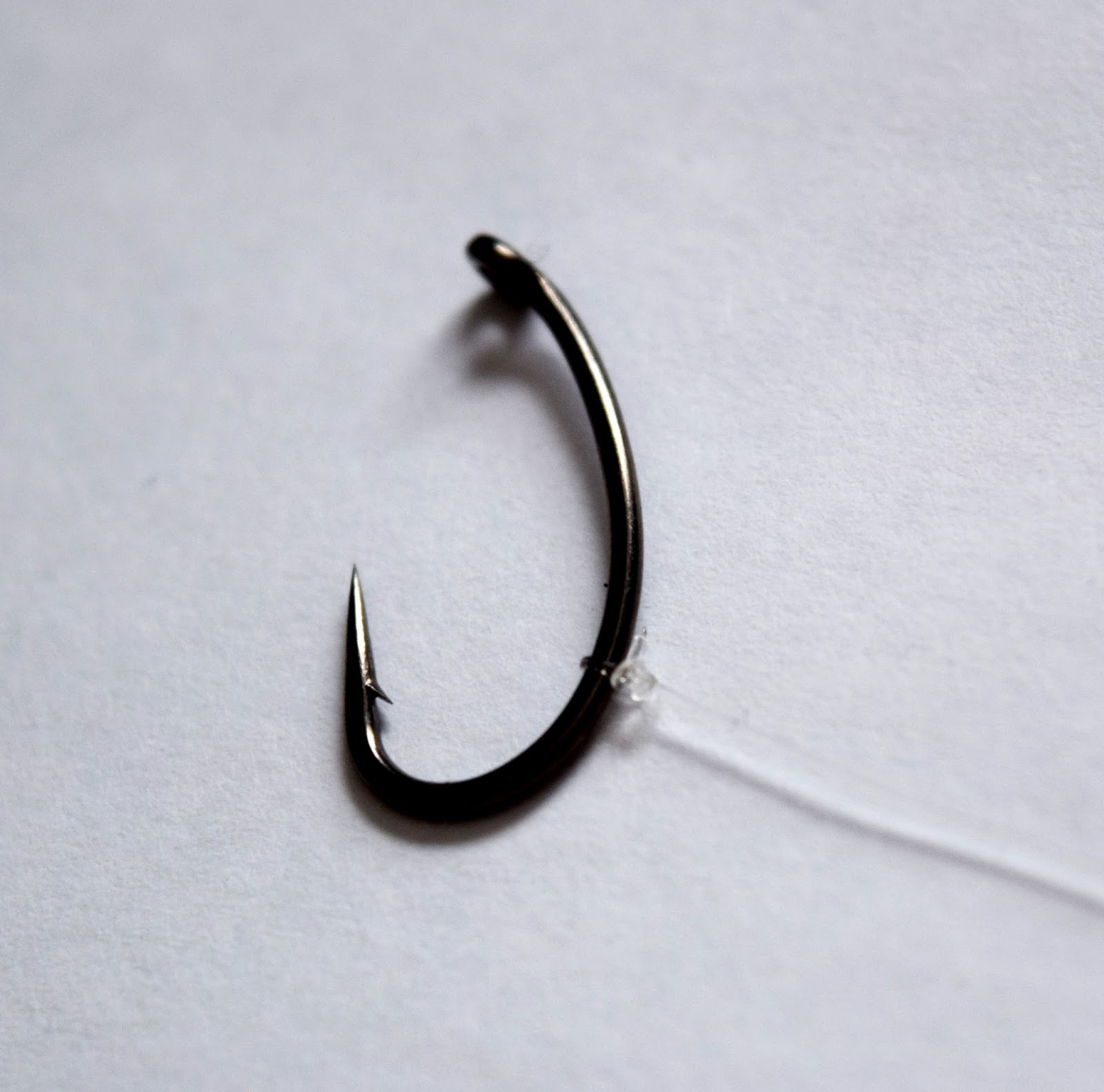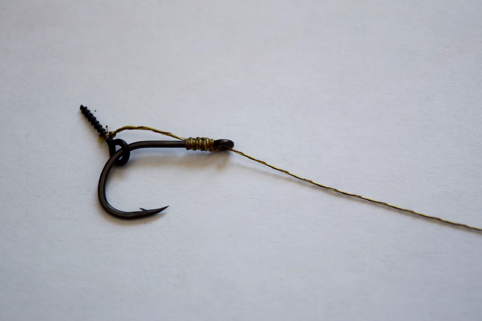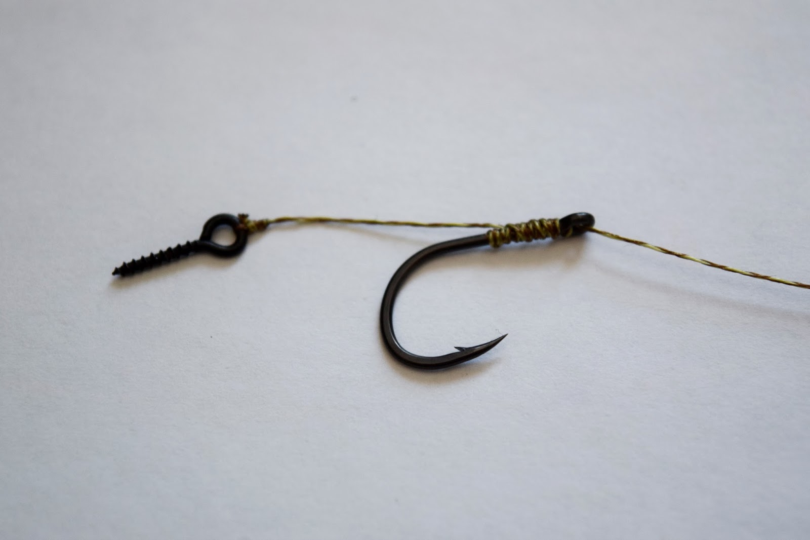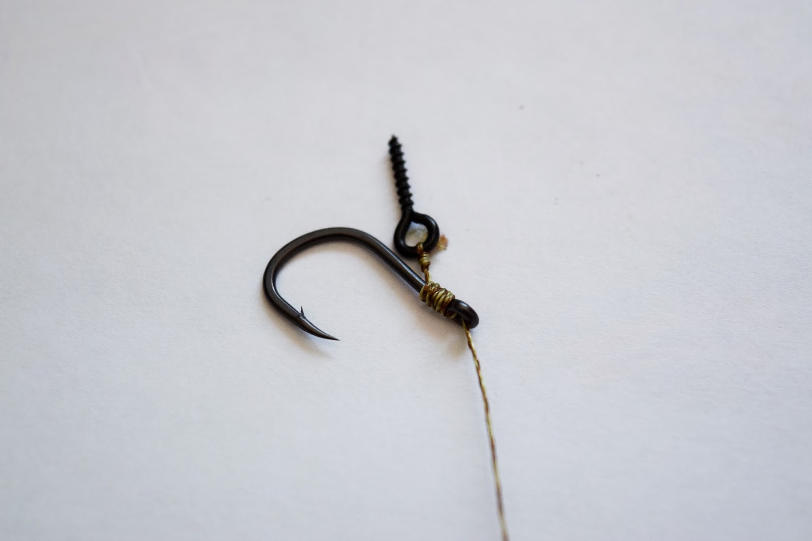 Oftast är det för pop-ups, whafters eller balanserade beten och sen en D-rigg av Fluorocarbon som är mitt val och du ska här få se hur jag gör den. Jag börjar med en liten blodknut på krokskaftet i höjd emellan krokspets och hulling, ni ser hur på bilden.Skruven monteras och sen gör jag en Knotless knot som vanligt, men jag går tre varv ner på krokskaftet, alltså under D:et och det öppnar upp D:et lite extra och skruven får mera rörelse och spelrum.