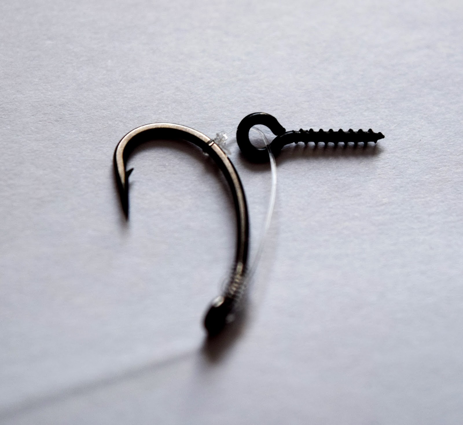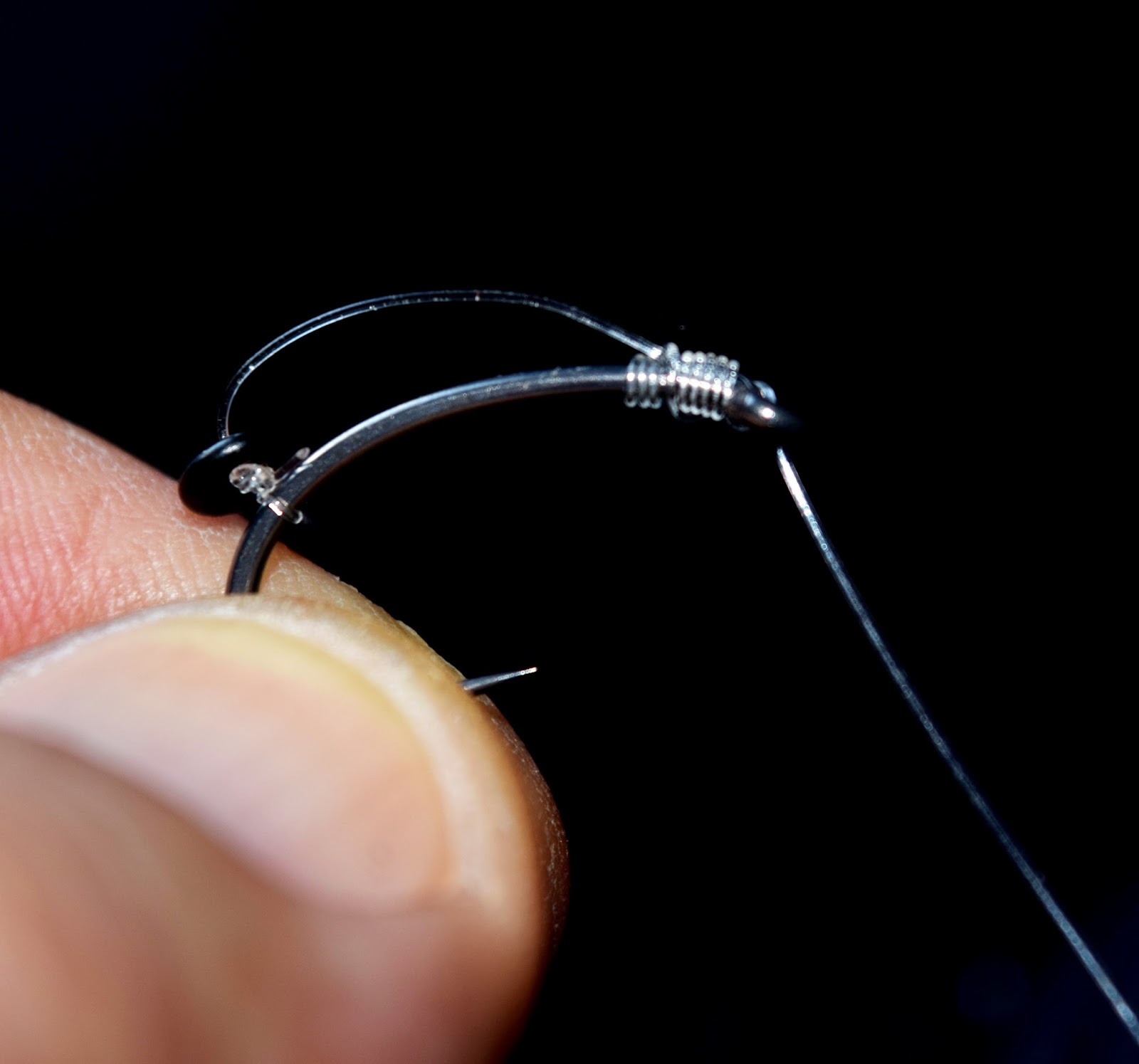 Här ett litet tips på vägen, vi har ringar som ska sitta på krokskaftet och dessa ska knytas och tanken kom bara att varför inte använda en baitscrew för detta. Knyt fast din baitscrew med en blodknut precis mellan gängans början och själva ringen.