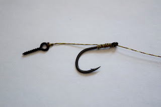 Trä på skruven och håll den tight där den ska vara och sen gör du din vanliga Knotless knot och det är klart. Skruva fast ditt bete och ringen fungerar precis som en rigg-ring, allt glider tillbaka mot knuten och kroken stannar i karpens mun.