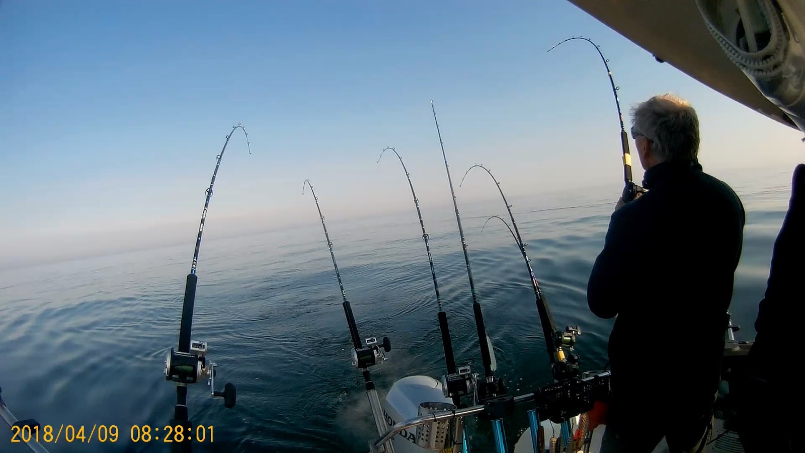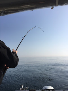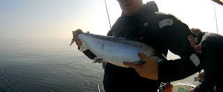 Fantastiskt fint väder, men lite trögfiskat. Tappade en lax intill båten på förmiddagen, tog sen en på 6-7kg på eftermiddagen. Testade att fiska på 36metersvatten till 44m, hittade dock inga heta ställen med betesfisk/bågar. Inga stora tempskillnader heller där vi låg, 12-16 nm sso Ystad
