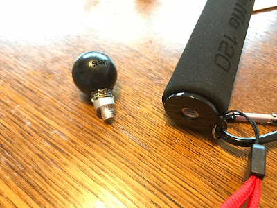 Så kommer trikset. B-kula med gjenger passer i bunnen på gjengene i selfiestangen. Det er helt vanlig 3.5mm hull akkurat som på de fleste kameraer og kamerastativer.