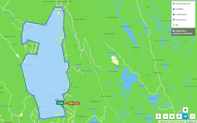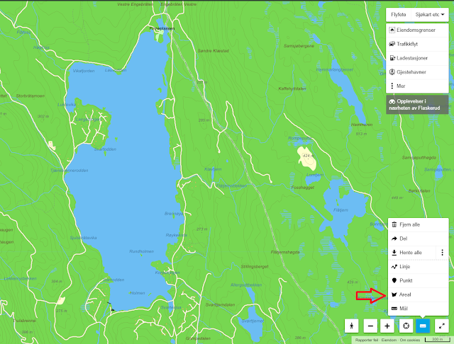 Etter å ha klikket får du opp en meny, i den menyen klikker du på "Areal" som på bildet over. Nå kan du klikke deg rundt innsjøen: