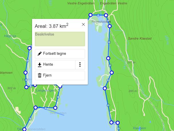 Når du har et brukbart omriss, klikker du på "Ferdig". Nå kan du klikke på omrisset og får da opp en boks med arealet: