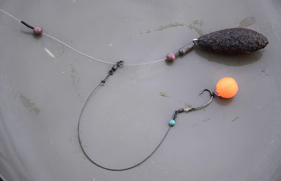 20 cm black Amnesia 20lb, 4 oz distans lead utan lekande, detta sitter i en quick link. 2 x 8 mm rubber beads, 1 chockbead och två små flötesstopp som du kan bestämma avståndet för dels bottnen och riggens rörelse. Fiskas naken och jag fiskar endast i Silt. Lycka till och skitfiske på er!