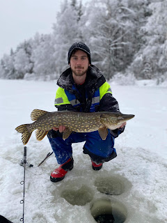 Vinteren kom rekordtidlig, og allerede 12 November var det duket for sesongens første ismeitetur. En helt ny plass skulle testes ut, og etter å ha sjekket litt dybder, ble det konstantert at maksdypet var ca 90cm. Ikke helt det vi håpet på, men vi måtte gi det ett forsøk. Gleden var stor da stanga plutselig stod i helspenn og sena fosset av snella. Gjedda ble målt til 110 cm og estimert til å veie mellom 8 og 9 kg. En godkjent start på sesongen!