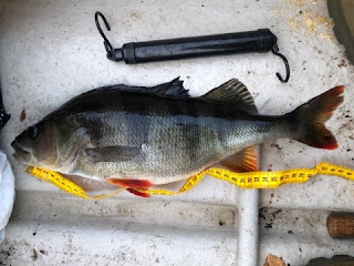 Drog en wobbler bakom kanoten ut till abborregrundet och där började jag pimpelfiska istället då wobblern inte gett något.