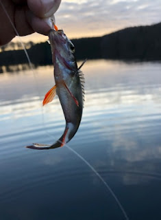 Totalt fångade jag 23 abborrar innan det blev för mörkt för att fortsätta. Det blev en underbar fisketur där pilgrimsfalk och korp spanade in mitt fiskafänge i solnedgången.