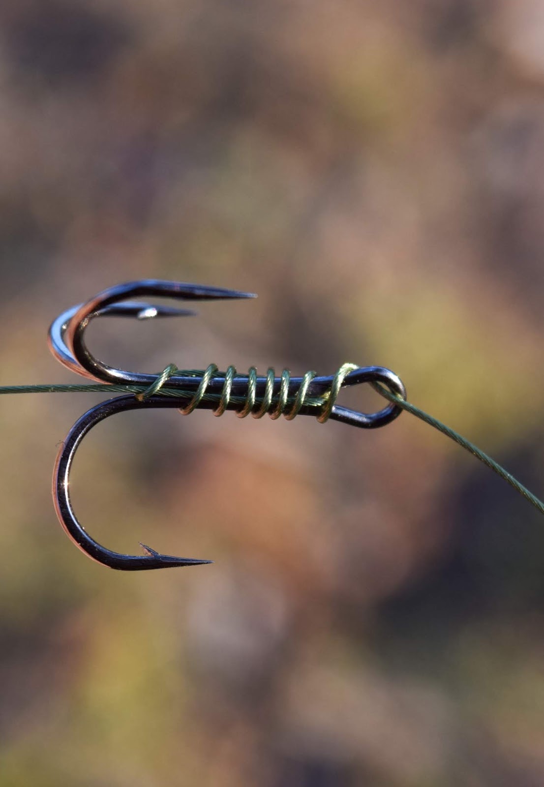 Jag har alltid flera olika wajertafsar klara och avståndet ligger mellan 7 - 12 cm, har du inga som dessa, så kan du snabbt anpassa en tafs för just den betesfisk du ska använda och du gör det enklast genon att knyta fast dina krokar som visat på bilden med en knotless knot.