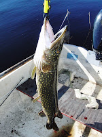 Tog mig chansen på ett morgonfiske idag, då inte vindarna var nå starka utan solen var framme och de var så gott som vindstilla. Åkte till de vanliga stället som jag besökte igår då de blev 5 gäddor med en topp på 3kg, efter några kast så small första på men de var en liten liten grön grej som ändå lossnade vid båten. Jag bytte bete till det bete som endast verkar leverera just nu, SMUTTLY DOG JR. Vinden kom lite lätt och blåste iväg båten utåt till djupare vatten, dock så hann jag kasta i de grunda partiet och sen fiska utåt, så ju närmare båten jag kom desto längre spinnstopp gjorde jag, och de gav resultat, ett slakhugg i högsta grad