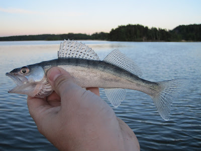 Nu går solen ner bakom träden och det börjar skymma. Jag åker tillbaks till 6:an och ser att det fortfarande är så gott som fisktomt här. Märkligt. Jag kör en stund och får sen dagens första gös. En urgullig liten firre som bara var marginellt längre än jiggen.