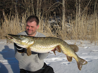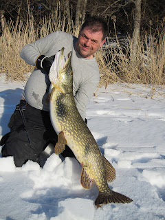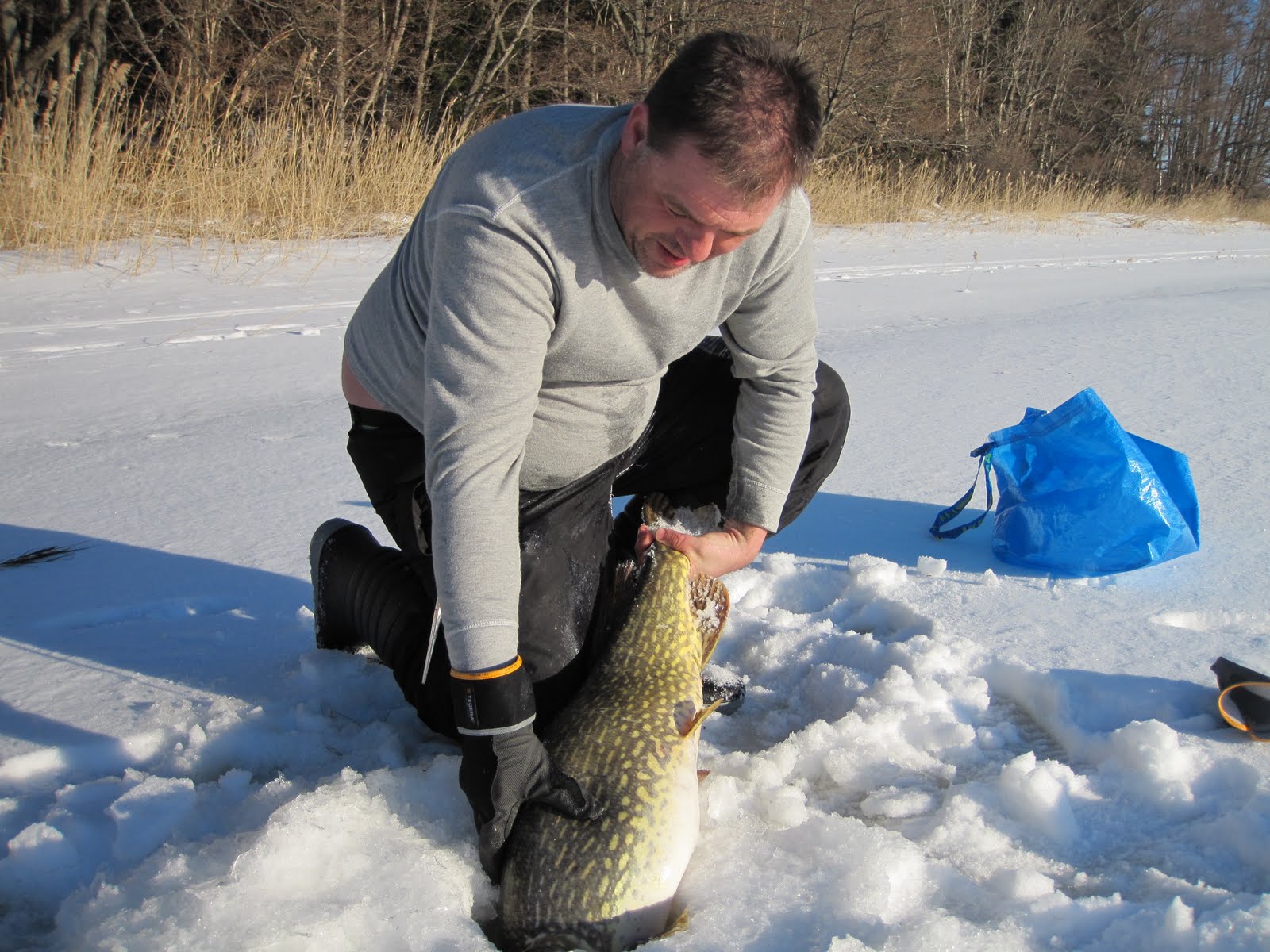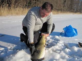 Gäddan stökar runt lite till och när den kommer upp för 3:e gången till hålet säger jag återigen till Stefan att det är en bamse-firre, mest för att retas lite. Sån är jag! ;-). Mannen bredvid mig ser än mer skärrad ut. Plötsligt lyckas vi leda upp huvudet i hålet och jag passar på och tar ett stabilt gälgrepp. En snabb förlösning och en ny gris har fått syna isen. Stefan drar av ett par glädjevrål med en skärande falsettröst som skulle slå vilken hes tonåring i målbrottet som helst, och drar samtidigt av en liten snabb glädjedans.
