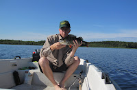 Testade ytterligare en risvåle utan något vidare resultat, en gädda tog på min Relax Shadjigg och några mindre borrar högg på den mindre Relax jag testade efter jag släppt tillbaka gäddan. Tog kaffepaus, käkade upp sista mackan och började fundera på om jag bara skulle få en enda abborre som man inte behövde skämmas för. Bestämde mig i alla fall för att dra till ett ställe med mycket näckrosor och där försöka lura någon gädda att hugga på Killer Frog. Riktigt roliga hugg blir det så jag tänkte det kunde vara en bra break från de fisktomma risvålarna. Tog inte många kast förrän en pigg liten gädda på runt kilot kastade sig över grodan men missade flera gånger. Tror det var först i fjärde försöket han lyckades och sen bjöd han på flertalet luftfärder under drillningen. Trots att han kämpat på så bra simmade han vidare såfort jag sänkte ner honom i vattnet igen, brukar ju få hålla i dom ett tag annars.