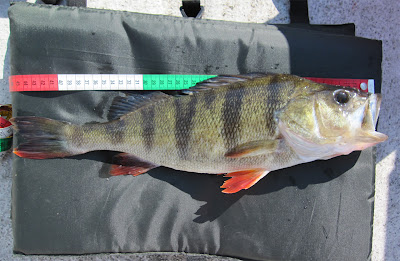 Drog vidare till sista risvålen och det fanns inga större förhoppningar om stordåd då vi inte haft nå bra fiske alls vid den sista tiden. Men redan i första kastet med min ledade Rapala Countdown högg en pigg abborre på 0,56kg. Efter det dröjde det inte länge förren en modell större på 0,89 kom upp. Båda riktigt roliga fighter då dom verkligen gav allt. Efter ett tag utan känning bytte jag till min svartvita Relax Shad och efter bara några kast hade jag ett bra hugg längs botten, tyvärr visade sig vara en gädda så det var väl inte undra på att det kändes lite tyngre. Fortsatte att nöta med jigg och precis när jag börjar fundera på att dra hem hugger det till rejält. Känner direkt på de snabba knycken i spötoppen att det är abborre på kroken och av ljudet från slirbromsen att döma var det en riktigt fin sådan. Blir lite nervös för att den ska lossna då det är ganska lätt hänt när man kör lite större shadjiggar utan stinger. Till sist kommer den upp nära båten och jag håvar den bara för att vara på den säkra sidan. Det visar sig vara dagens största abborre med sina 1,1kg och 45cm. Därmed blev det 2 årsbästa på abborre med 0,89 samt 1,1kg. Alla fiskarna fick såklart simma vidare, ser fram emot att försöka överlista dom igen lite senare i höst när de ätit upp sig rejält.
