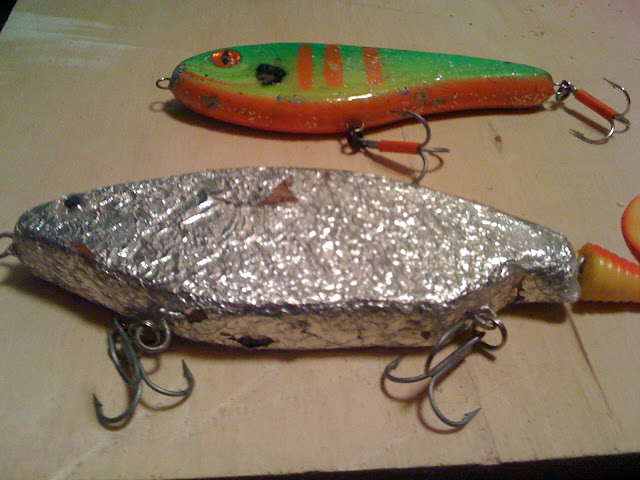 Idag vart det en kort tur. Jag har inte hunnit/orkat att lacka om mina favo drag och det kändes lite tråkigt att inte fiska med mina hemmagjorda. Så jag kollade igen och tog den andra mörten som jag har lagt en skruv för jiggar på baksidan. Fäste en Super Goober 8 och Efter några kast får jag en efterföljare, vid nästa kast tar den betet och jag kan landa ett kilos gädda. Kul! den här fungerar också