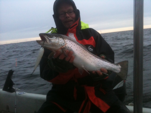 63 cm + 1 vild öring ca 60 bägge tog vit ismo glow baksida