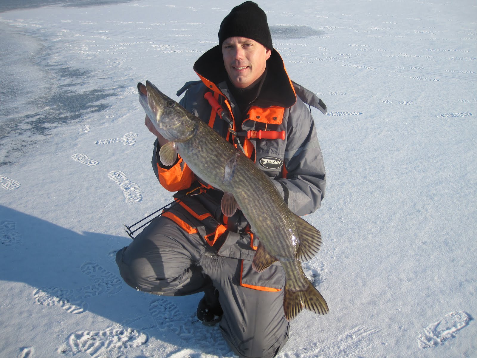Efter en stund upptäcker Utte ett napp längst ut på ett av mina grundspön. Under rusningen ut knallar vi förbi ett av mina andra grundspön och upptäcker att den "smyg-löst". Utte får inspektera den redan spottade mörten medans jag inspekterar min spottade mört längst ut. Segt att gösen kan vara så jäkla kinkig ibland! Ner med mörtarna igen och tillbaks till stolen. Uttes spön utåt är totalt iskalla och rör sig inte en millimeter. En bra stund senare och efter en del oro på ett par av mina spön fäller så grundspöet längst ut igen. Snabb rusch ut och denna gång kan jag kroka på löpande lina. Fast fisk och en fin gädda i 3-4 kilos klassen får syna isen.